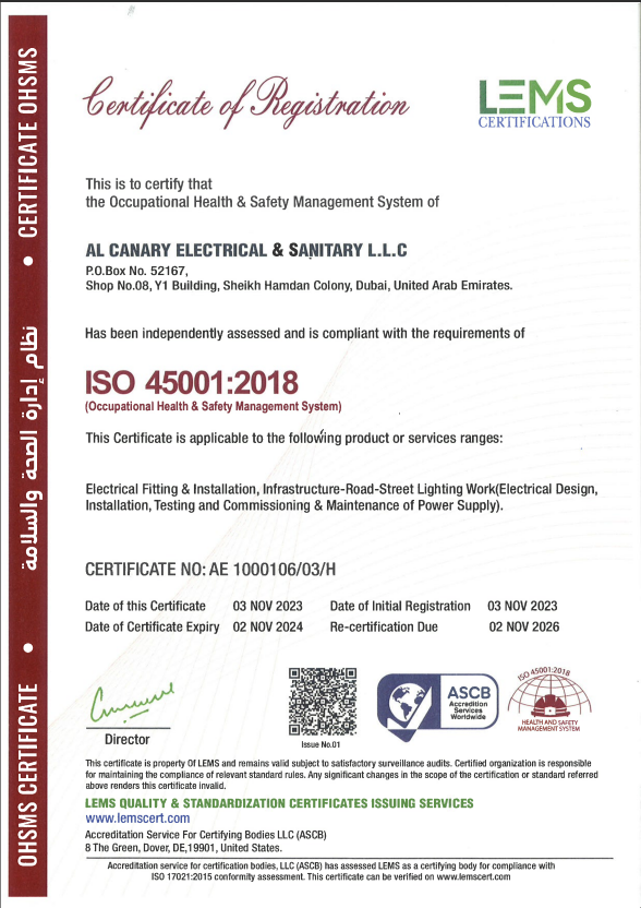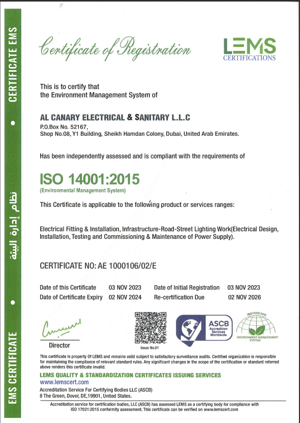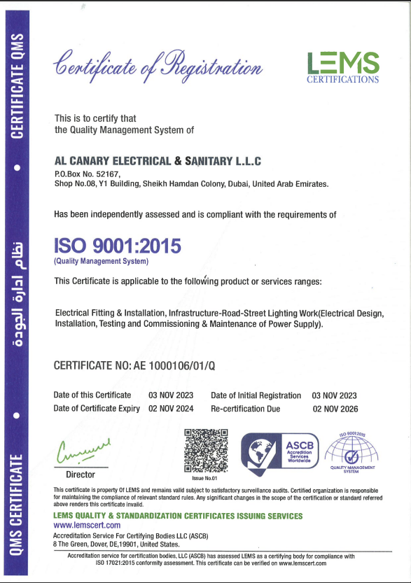 Al Canary Electrical & Sanitary LLC is in process of getting ISO Certificate from the